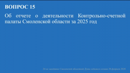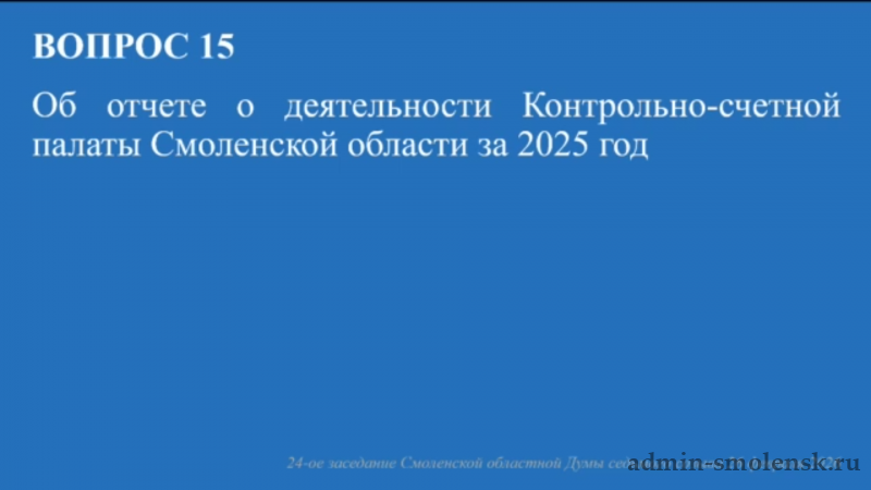 Представленный председателем Контрольно-счетной палаты Алексеем Вячеславовичем Циганковым Отчет о деятельности Контрольно-счетной палаты Смоленской области за 2025 год принят депутатами Смоленской областной Думы к сведению.
